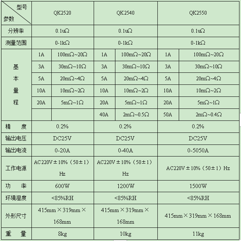 QK2540(40A)直流电阻测试仪,又名直流电阻快速测试仪,测量仪、感性负载测试仪,产品采用全新电源技术,输出电流大,电压高;DSP作为处理核心,功能强大,自动完成校验、稳流判断、数据处理、阻值显示等功能,可测量各种类型变压器的直流电阻。特别适合大型变压器直流电阻的测量。产品具有操作简单、精度高、抗干扰、防震、携带方便等特点。重量是同等级三分之一。