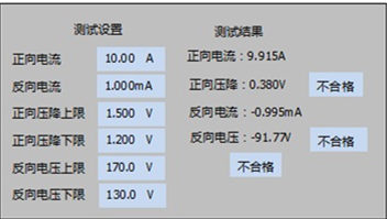 1. 导通压降测试是测试整个太阳能接线盒(n个二极管串联)通过设定电流的正向压降,如上图中:设定电流10A,(三个二极管)测试压降在1.3V-1,5V合格。